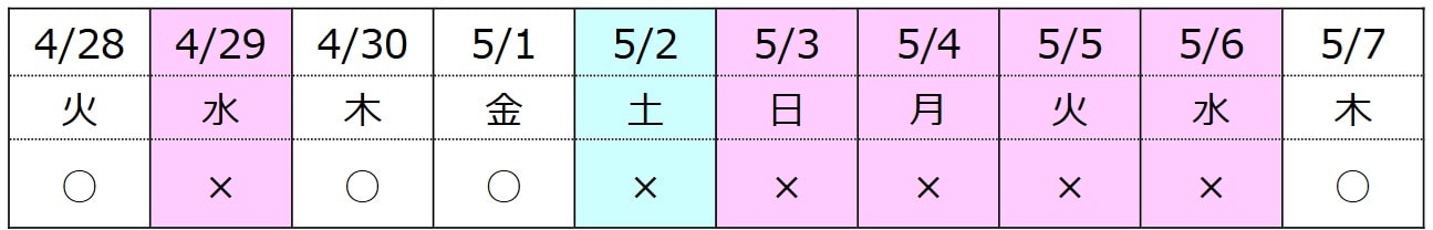※暦通り4月30日(木):平日5月1日(金):平日は営業致します。